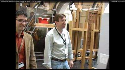 Update - a few translation issues mean that I got some details in my first post wrong. Including, er, the wrong image, as the new discovery was not in fact illustrated in the El Pais story. So, sorry about that. The above photo is the correct image (I hope!), and is the best we can get for now. The only colour image I have at the moment (below) is from a screen grab from this Prado video, when the picture is seen briefly in the background of the conservation studio.