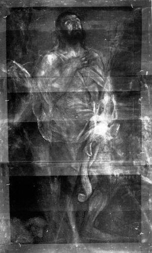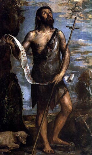 A reader in Spain kindly alerts me to an intriguing Titian discovery at the Prado, which has not made it into the wider press. In the Prado's conservation studio at the moment is a previously lost St John the Baptist by Titian (above). It was thought, mainly due to condition issues, to be a copy of a missing original. But an x-ray (below) of another version (bottom, at the Escorial, near Madrid) has revealed two whopping pentimenti - St John's right arm was originally at his chest, and also extended down to the left - which match up with the newly discovered version. The conserved picture will apparently be presented to the public this autumn, when conservation has finished. It was recently lent to the Prado by a chuch in Cantoria, in southern Spain. More details here (in Spanish).