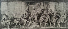 The Christie's catalogue speculates that the newly found study relates to Van Dyck's grisaille in the Ecole Nationale Supérieure des Beaux-Arts in Paris (above), which is all that survives of the artist's commission to paint the Brussels magistracy. In the grisaille, 7 sitters are seen. But we are fast running out of candidates for the head studies to relate to, for the new Christie's study and the Ashmolean heads could be said to candidates for the figures with their heads turned to the right.