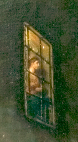 Update - Lucy Bamford, the curator at Derby, has kindly sent a high-res image, and below are some close ups. I'm sure that the picture is indeed by Wright - we can tell that alone from the little figure in the window, and also the foliage and sky at the top left.