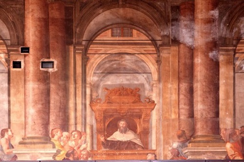 News from Italy that a set of seventeenth century frescos in the Basilica of San Martino Maggiore, Bologna, have been restored. The scene entitled La lezione di San Pier Tommaso o Tomà was completed by the figure painter Lucio Massari and the architectural painter Girolamo Curti in 1629. The project has been the pipeline since 2017 when it was decided that the frescos should be conserved and displayed to the public.
