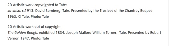 Yes, all except one – Tate. This is where the copyright issue gets even more interesting. For some years now (I have seen their internal emails) Tate has recognised the significance of the new, post-Infopaq copyright test in UK law. That’s why if you look really closely at their website and Tate Images small print (like their FAQ page about which caption to use for a Turner, as below), they do not claim copyright in photos of artworks which are themselves out of copyright.