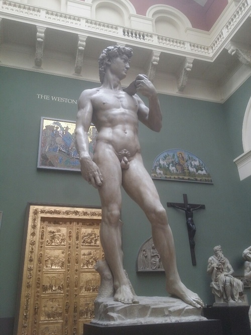 I had a look at the V&A's newly restored cast galleries on Wednesday, and very fine they are too. I was delighted to see, on the back of the plinth for their full-size copy of Michelangelo's David, the above plaster fig leaf. It used to be fixed to David's, er, Goliath for royal visits. Apparently, it hasn't been used since the early 20th Century. How times change...