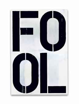 By breaking the words into their constituent letters and separating them out within a pictorial grid, Wool destabilizes the coherence of each word, thereby hinting at the fallibility of language itself. In the present work, he separates “FOOL” into “FO” and “OL,” so that the letters are prohibited from their descriptive role in forming words, and are left to exist simply as formal elements within a white field. This technique is especially potent considering the letter-count of “FOOL:” it contains four letters that fit so perfectly within Wool’s four quadrants, not unlike Indiana’s LOVE or Warhol’s early photo-booth self-portraits. Even the letters themselves are fractured by virtue of their stenciled nature; small slits cut into the stencil to allow for easier dissemination so that the “O” in “FOOL” is not a perfect circle, but bifurcated down the middle into two separate halves.
