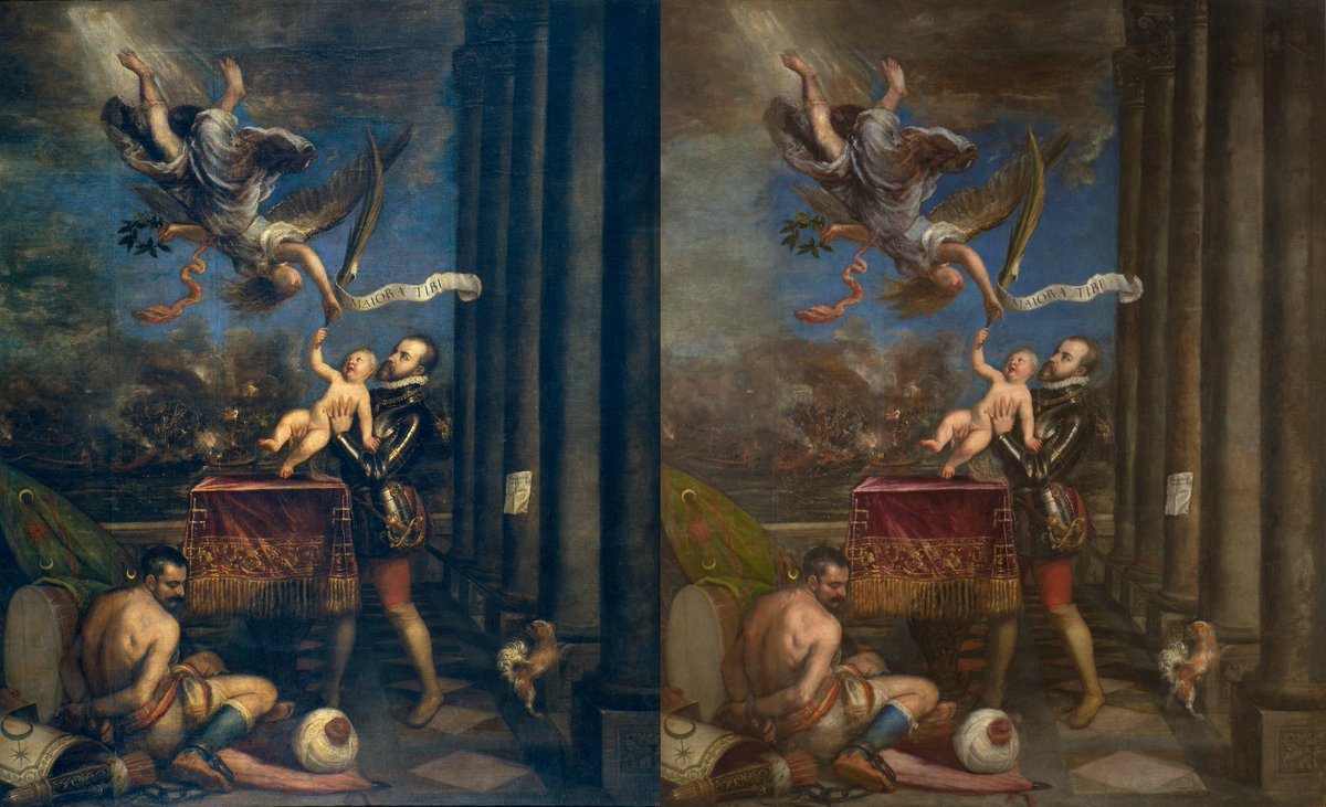 The Prado has cleaned one of its major Titians, Philip II offering the Infante Don Ferdinando to Victory. The online catalogue still shows the pre-cleaning photo, but you can zoom in on a before and after image here.